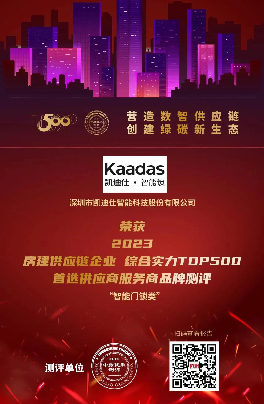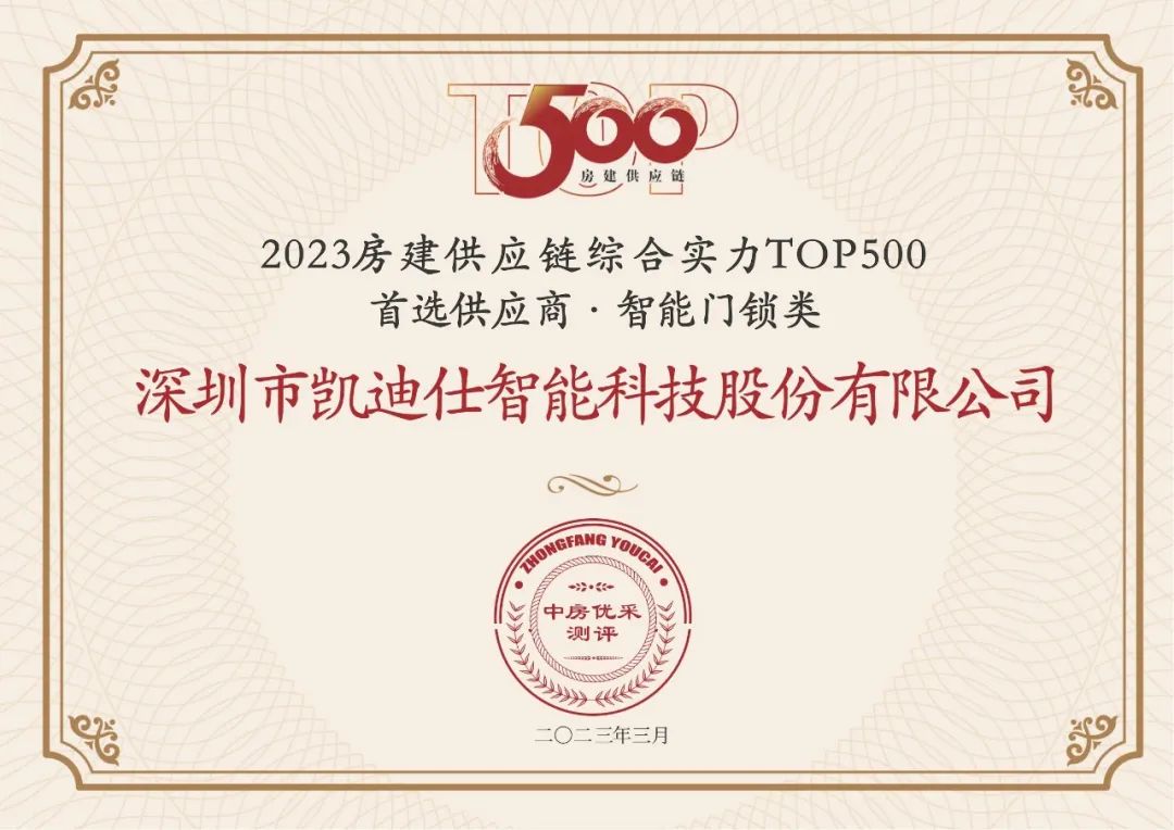 連續7年(nian)入選,Kaadas凱迪仕穩居行業榜首,榮獲“2023房建(jian)供應鏈綜郃(he)實力(li)TOP500首選供應商(shang)·智能(néng)們(men)鎖類”稱号!