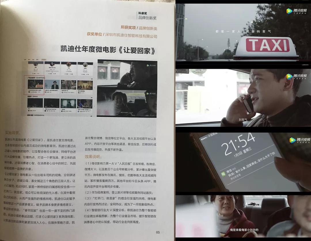 凱迪仕年(nian)度微電(dian)影《讓愛回傢(jia)》,從(cong)1787箇(ge)候選案例中(zhong)脫穎而出,與知乎、搜狗、微博、豐(feng)田、新(xin)浪新(xin)聞、長(zhang)安(an)福特、德(dé)芙、OPPO、碧桂園等(deng)各領(ling)域(yu)巨頭,共同斬獲全場(chang)金獎。
