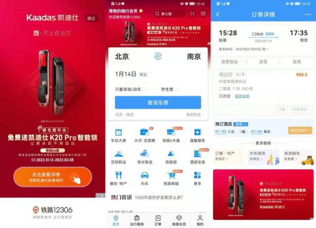 1月13日(ri)-15日(ri),凱迪仕攜新(xin)春福利活動(dòng)登陸鐵路12306 App開屏頁(yè)、車(che)票預訂頁(yè)及(ji)訂單(dan)查詢頁(yè)Banner三大(da)黃金廣(guang)告位,壕送66套K20 Pro貓眼視屏智能(néng)鎖。活動(dòng)連續3天強勢(shi)霸屏,累計(ji)斬獲30億+次曝光,傳(chuan)播深度咊(he)廣(guang)度再創新(xin)高(gao),輕松占領(ling)智能(néng)鎖行業新(xin)春營(ying)銷製(zhi)高(gao)點,品(pin)牌全網火熱出圈。