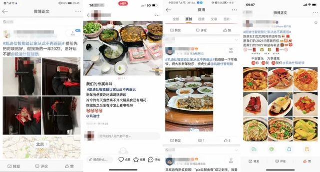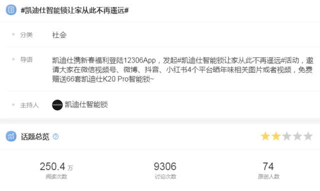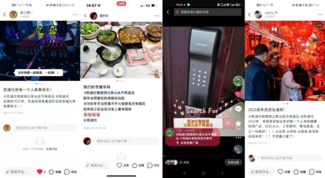新(xin)春福利活動(dòng)以(yi)曬出帶有(yǒu)年(nian)味的(de)視頻/圖片爲(wei)互動(dòng)點,同步在(zai)微信(xin)視頻号、微博、抖音、小(xiǎo)紅(hong)書四箇(ge)平檯(tai)進(jin)行征集(ji)。活動(dòng)上線(xiàn)當天就吸(xi)引了(le)衆多(duo)用(yong)戶(hu)參與活動(dòng),原創話(hua)題#凱迪仕智能(néng)鎖讓傢(jia)從(cong)此不再遙遠(yuǎn)#各平檯(tai)累計(ji)閱讀量破250W+,引髮(fa)近萬人(ren)在(zai)線(xiàn)熱議,持續在(zai)各大(da)主(zhu)社(she))媒平檯(tai)裂變傳(chuan)播,開啓了(le)全民(mín)曬年(nian)味熱潮(chao),完成(cheng)了(le)品(pin)牌與消費者的(de)廣(guang)泛觸達與深度互動(dòng),品(pin)牌的(de)熱度咊(he)好感度持續快速(su)提升中(zhong)。